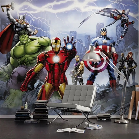 Iron Man, Captain America, Hulk, Thor og Black Widow samles i en episk scene foran en ødelagt bybaggrund. Det dramatiske tapet emmer af action og heltemod og giver rummet masser af power – perfekt til unge Marvel-fans med sans for superhelte og store fortællinger.