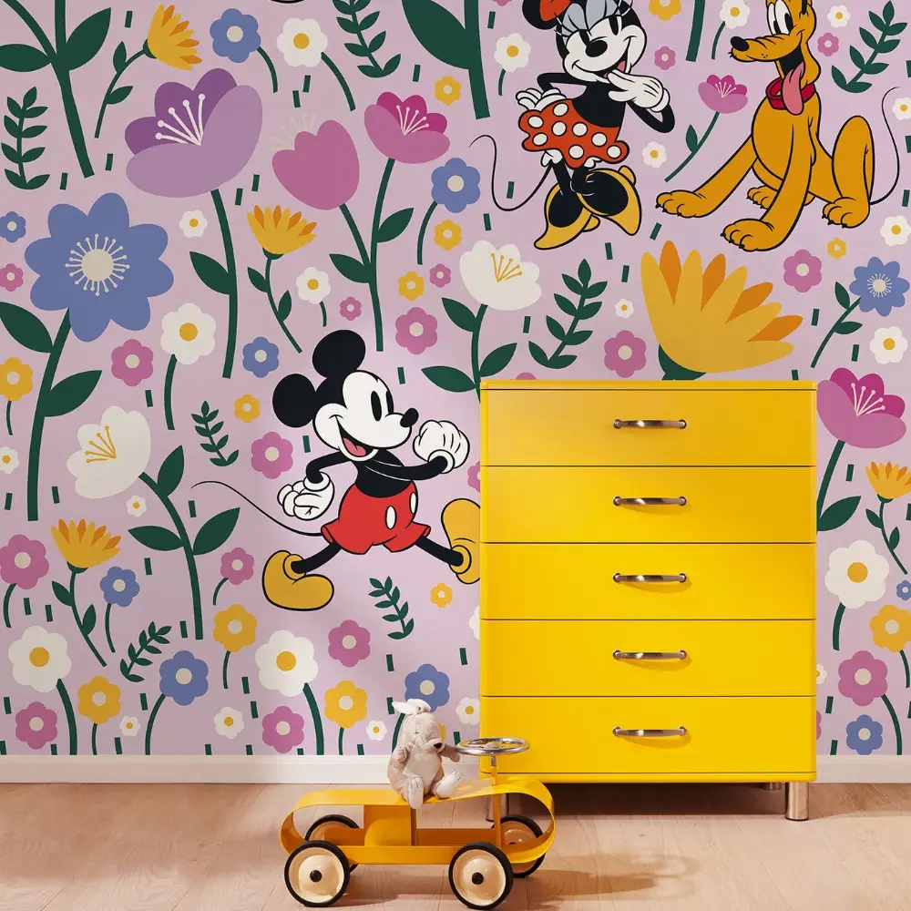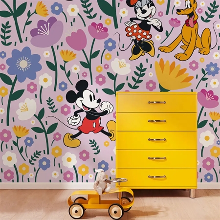 Mickey, Minnie og Pluto leger på en blomstereng i dette farverige og livlige fototapet. Også Daisy Duck kigger forbi og passer perfekt ind i det solrige motiv, som tilføjer både friskhed og legende charme til ethvert børneværelse.