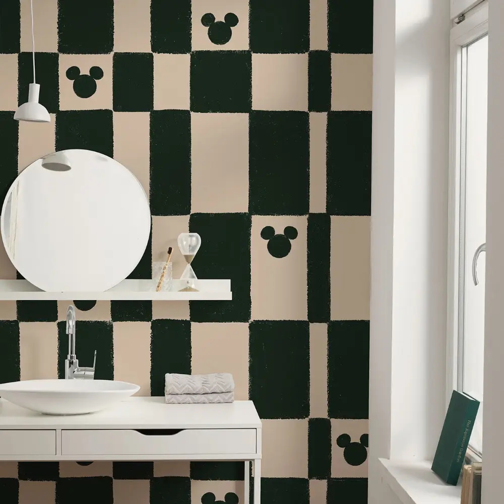 Et stilrent skakmønster i to farver danner baggrunden for dette grafiske tapet, hvor Mickey Mouse-hovedet er skjult som en del af designet. Et motiv med legende lethed og diskret Disney-elegance – perfekt til børneværelser og rum, hvor man ønsker et subtilt, men karakterfuldt udtryk.