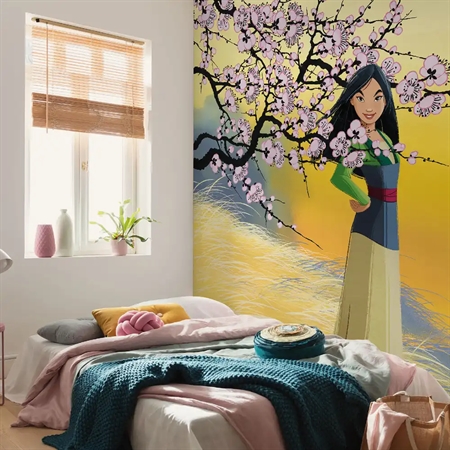 Kirsebærblomsterne springer ud, og Mulan står stolt i forgrunden på dette elegante fototapet. Farvekombinationen af gul og lyserød skaber en blid forårsstemning og fremhæver Mulan fra sin mest harmoniske og inspirerende side. Et tapet med styrke, skønhed og ro – ideelt til børneværelser med karakter.