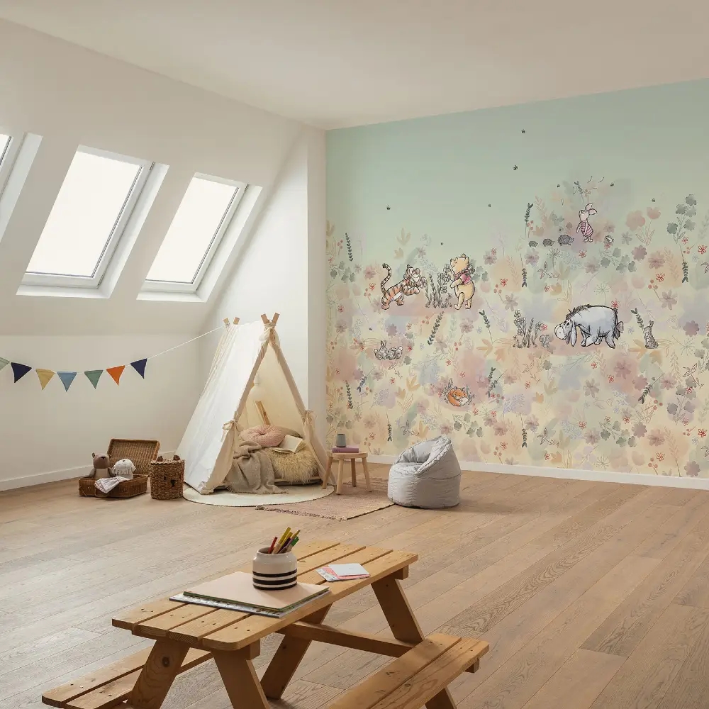 Dette stemningsfulde tapet forvandler børneværelset til et eventyrligt sted fyldt med blomster, dyr og genkendelige figurer fra Peter Plys’ univers. Et roligt og fantasifuldt motiv, der indbyder til leg, fordybelse og tryghed i hverdagen.