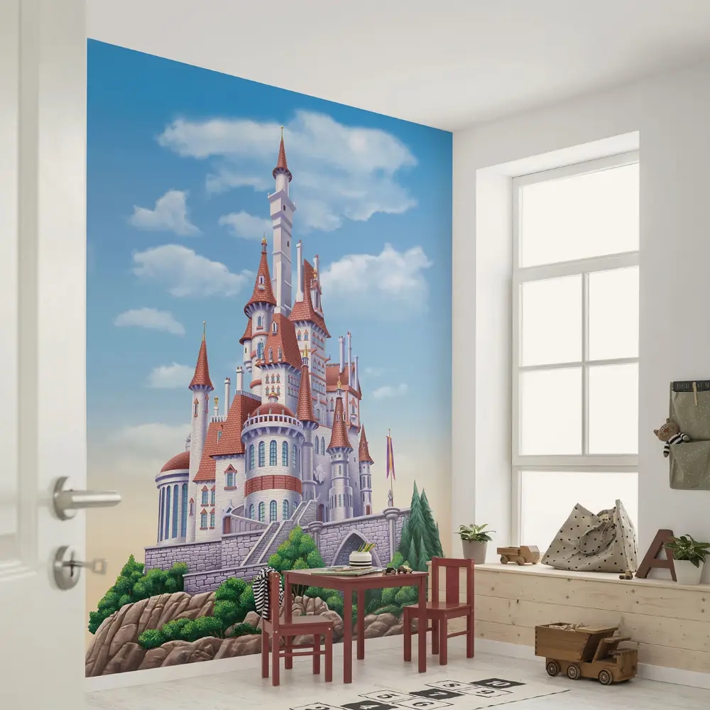 Det ikoniske slot fra Skønheden og Udyret troner midt i en eventyrlig skov, indhyllet i mystik og magi. Tapetet vækker drømme og nysgerrighed og skaber den perfekte baggrund til børneværelser, hvor fantasien får lov at blomstre – et oplagt valg for små prinsesser med store drømme.