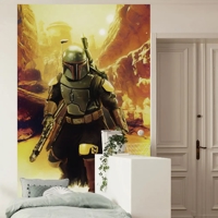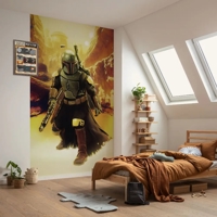 Boba Fett som han lever og ånder. Dette imponerende fototapet indfanger perfekt den ikoniske dusørjægers mystiske aura. Den gyldne baggrund tilføjer motivet en episk stemning og fylder rummet med en varm, atmosfærisk glød – perfekt til både børneværelset og filmrummet.