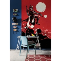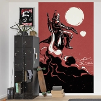 Dette stilrene fototapet er et must-have for Star Wars-fans og retroelskere. Boba Fett står som en grafisk silhuet mod en rød og sort baggrund, der giver tapetet et moderne og minimalistisk udtryk. En hyldest til den ikoniske dusørjæger – perfekt til soveværelset, filmrummet eller teenageværelset.