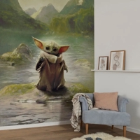 Grogu sidder afslappet på en sten med et fredfyldt bjerglandskab i baggrunden. De grønne farver og det enkle motiv skaber en sanselig og rolig stemning, der gør tapetet perfekt til både børneværelset og rum, hvor der skal være plads til fordybelse og fantasi.