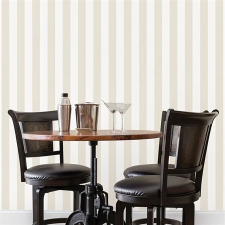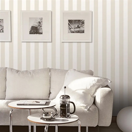 Et roligt og elegant tapet med brede striber i lyse beige nuancer. Awning Stripe Beige skaber en harmonisk og afslappet atmosfære – perfekt til dig, der ønsker et afdæmpet og tidløst udtryk, der let kan kombineres med både lyse og mørke møbler.