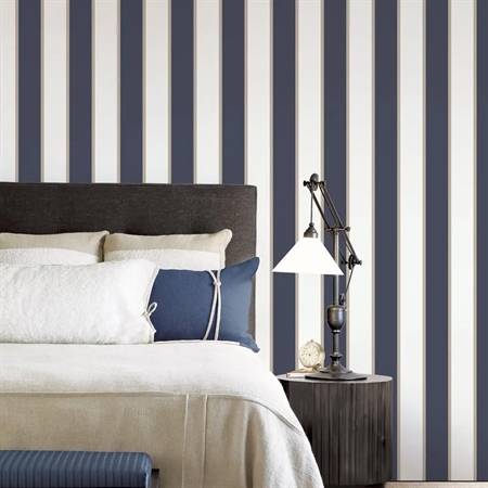 Et markant tapet med striber i varierende bredder i creme og dyb marineblå. Formal Stripe Cream/Navy skaber en elegant rytme på væggen og kombinerer klassisk farvespil med moderne enkelhed – et raffineret valg til både stue, kontor eller soveværelse.
