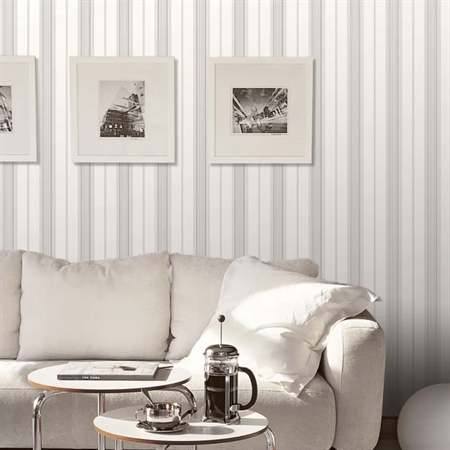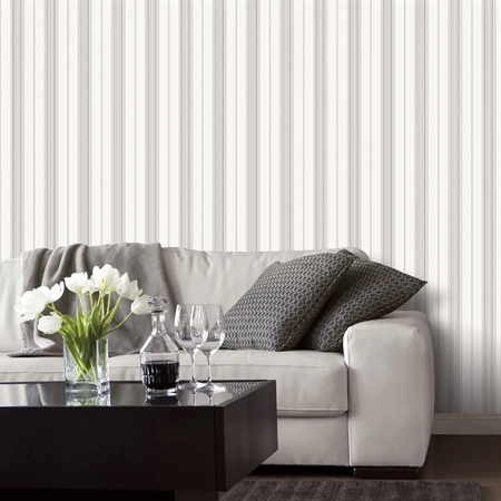 Slim Stripe Grey er et elegant tapet i afdæmpede grå og hvide nuancer. De fine lodrette striber skaber en rolig og raffineret atmosfære, og giver samtidig rummet en fornemmelse af højde og lethed.