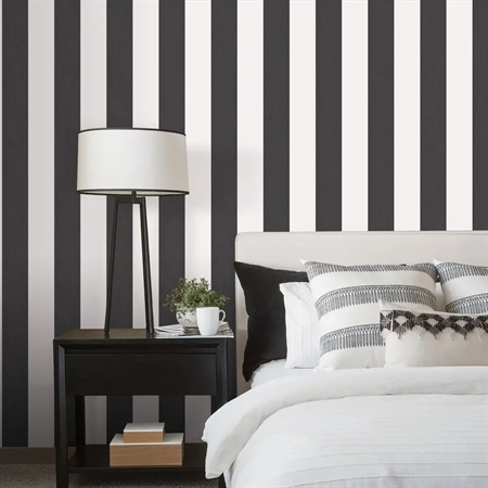 Et grafisk tapet med brede, kontrastfyldte striber i sort og hvid. Surface Stripe Black/White skaber en skarp og moderne effekt, der tilfører rummet kant og karakter – ideelt til dig, der ønsker et stilrent statement i alt fra soveværelset til hjemmekontoret.
