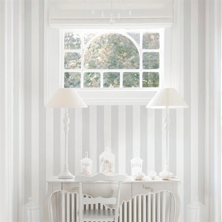 Et elegant tapet med brede, symmetriske striber i sølvgrå. Surface Stripe Silvergrey skaber en rolig og raffineret baggrund med let glans, der giver et diskret spil af lys og skygge – ideelt til både lyse og dæmpede indretninger.