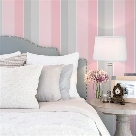 Et elegant tapet med brede lodrette striber i bløde rosa og grå nuancer. Wide Stripe Pink/Grey tilfører rummet en rolig, lys og moderne atmosfære – perfekt til dig, der ønsker et afdæmpet men stilfuldt udtryk med et feminint touch.