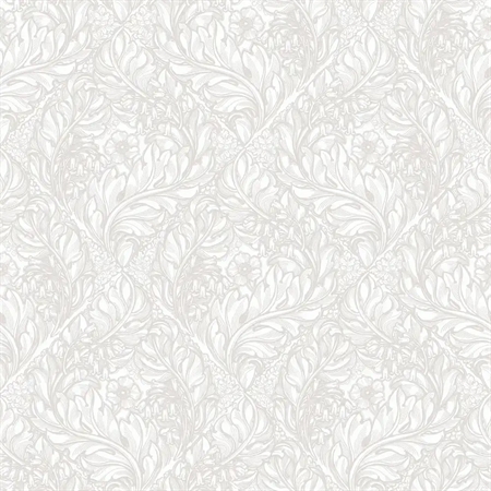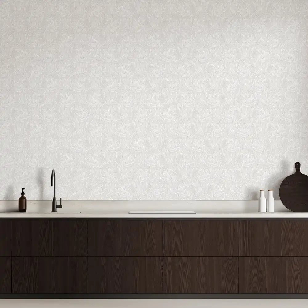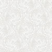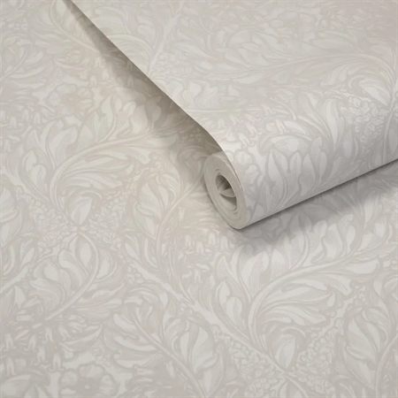 Et let og elegant botanisk tapet med stiliserede blade og blomster i et gentagende mønster. De bløde hvide nuancer fremhæver motivet og giver tapetet et diskret, næsten præget udtryk, hvor farvespillet tilfører dybde uden at tage fokus.