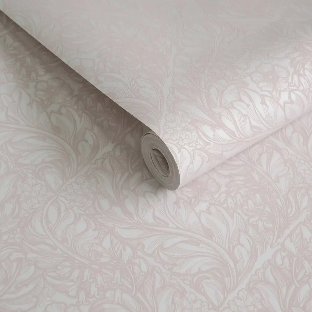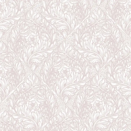 Et blødt og romantisk botanisk tapet med blade og blomster, der slynger sig i et let geometrisk forløb. De afdæmpede rosa nuancer og det diskrete, næsten prægede udtryk giver tapetet en fin dybde og en underspillet elegance.