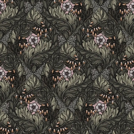 Et sofistikeret botanisk tapet med store blade arrangeret i et symmetrisk, næsten geometrisk mønster. De fine blomster samler sig mellem bladene og tilfører motivet detaljer og dybde, mens samspillet mellem grønne og rosa nuancer giver tapetet et tidløst og harmonisk udtryk.