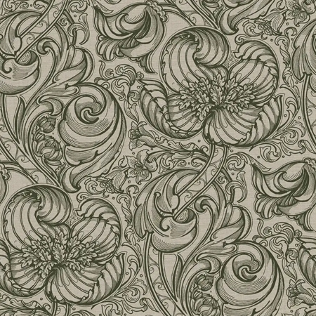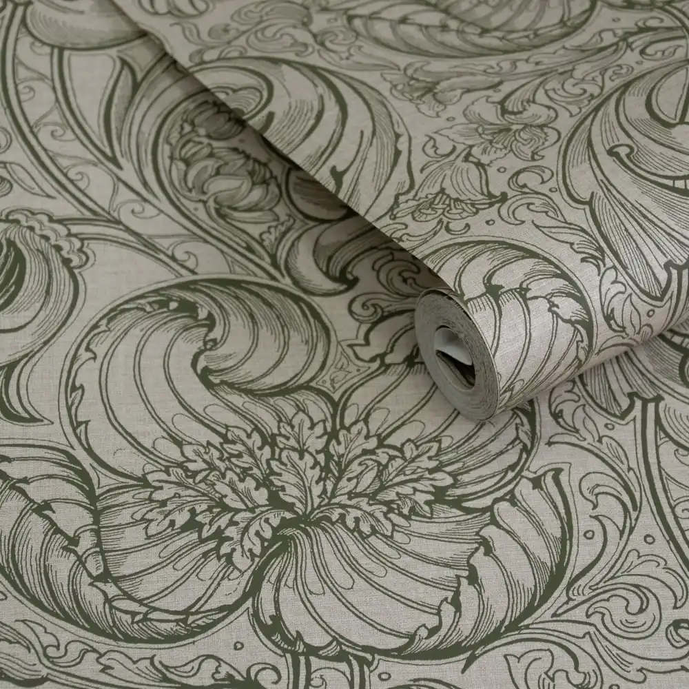 Et markant og detaljerigt botanisk tapet med blomster i fuldt flor og tydelige kronblade, der breder sig over hele fladen. De fine linjer i motivet træder klart frem i de grønne nuancer og giver tapetet et kraftfuldt og karakterfuldt udtryk.