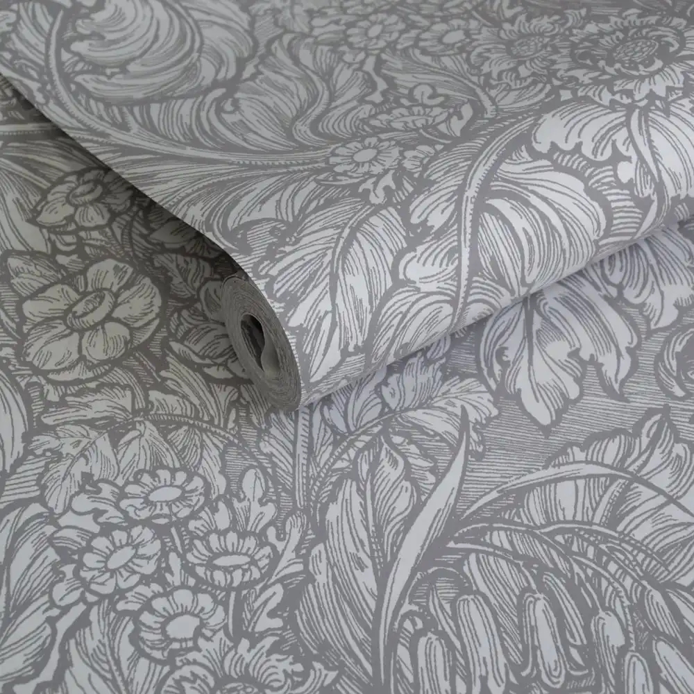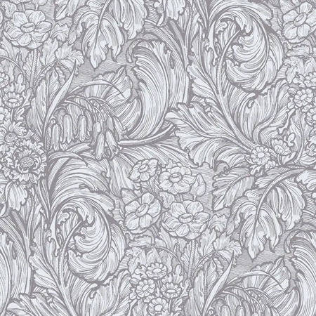Et elegant botanisk tapet med tydelige referencer til klassiske, victorianske motiver. Store, detaljerede blade fletter sig sammen med et varieret flor af blomster, gengivet i afdæmpede sølv- og grå nuancer, som giver tapetet et sofistikeret og roligt udtryk.