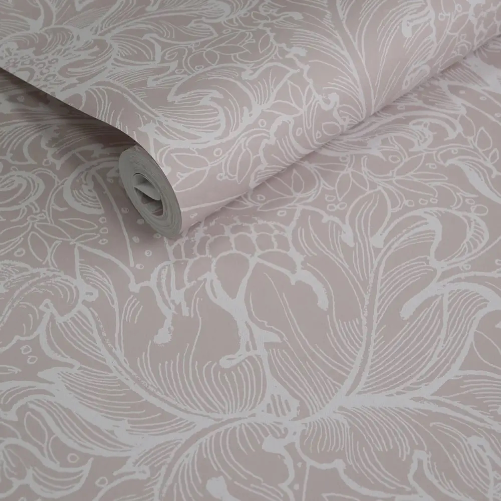 Morris Major Pink er et klassisk blomstertapet med et tæt, dekorativt mønster af slyngende ranker og fine florale detaljer. Den bløde rosa bundfarve giver tapetet et let og romantisk udtryk, hvor mønstret fremstår elegant og velafbalanceret uden at dominere rummet.