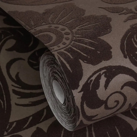 Damask Sauvage Bronze/Brown er et klassisk damasktapet med et markant, symmetrisk mønster af store stiliserede blomster og blade. De varme brune toner står i kontrast til den diskret bronzefarvede bund og giver motivet en rig og indbydende dybde.