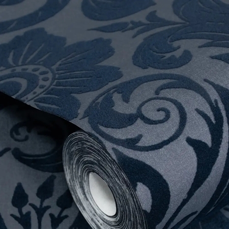 Damask Sauvage Navy Blue er et klassisk damasktapet med et rigt, symmetrisk mønster af stiliserede blomster og blade. Den dybe marineblå farve giver motivet tyngde og fremhæver de ornamentale detaljer, som træder markant frem mod baggrunden.