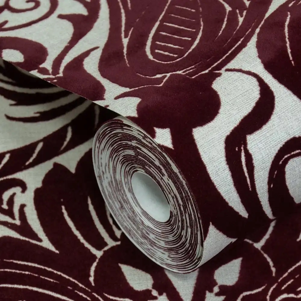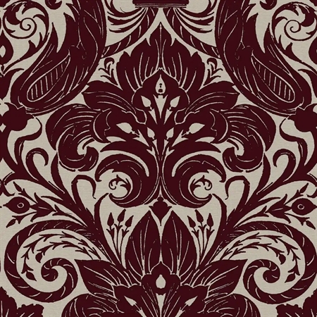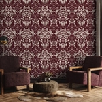 Damask Sauvage Red er et klassisk damasktapet med et detaljeret og symmetrisk mønster af slyngende blomster og ornamentale former. De dybe røde nuancer giver tapetet et varmt og markant udtryk, hvor motivets fine linjer træder tydeligt frem.