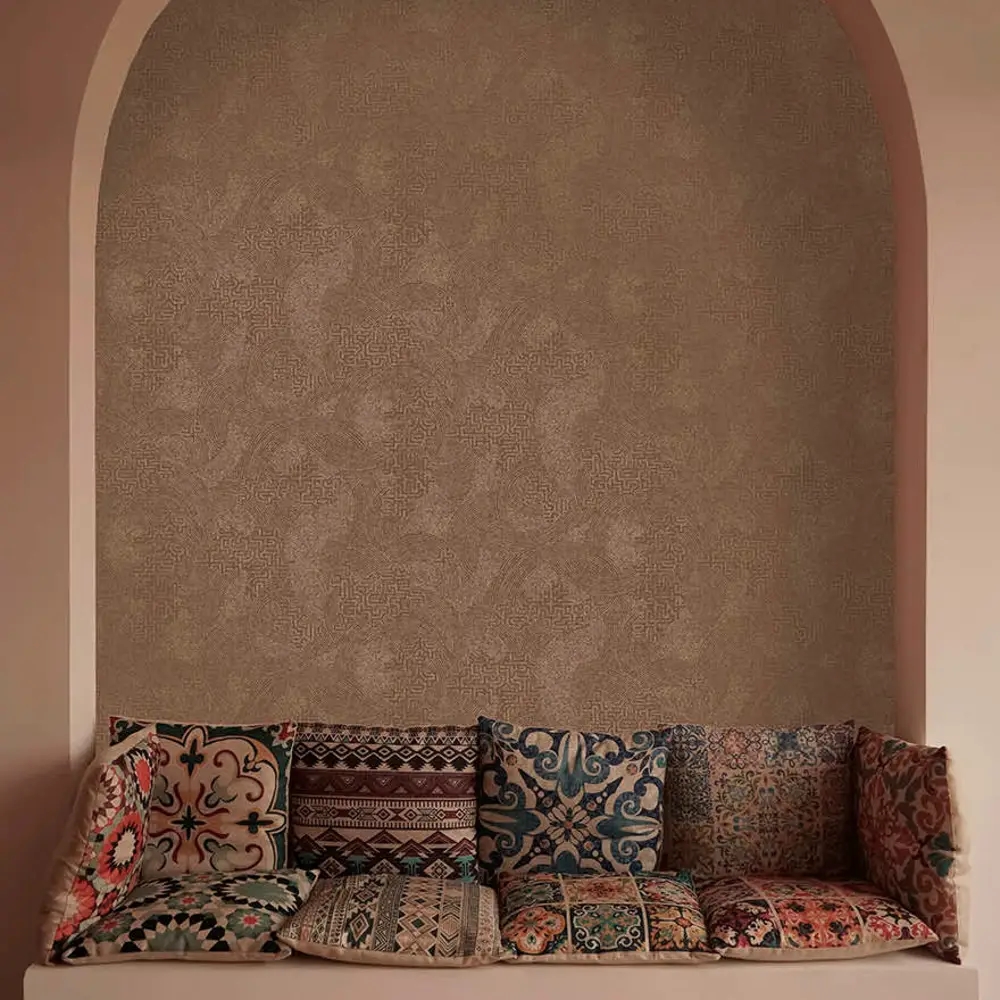 Et markant og moderne tapet inspireret af Richat-strukturen – også kendt som Saharas øje – med sine cirkulære, eroderede ringe. Det abstrakte mønster består af fragmenterede, sammenvævede linjer, labyrintlignende former og uregelmæssige prikker, som tilsammen skaber et levende og grafisk udtryk. De varme rustnuancer tilfører dybde og karakter og gør tapetet velegnet som et dekorativt statement i rummet.