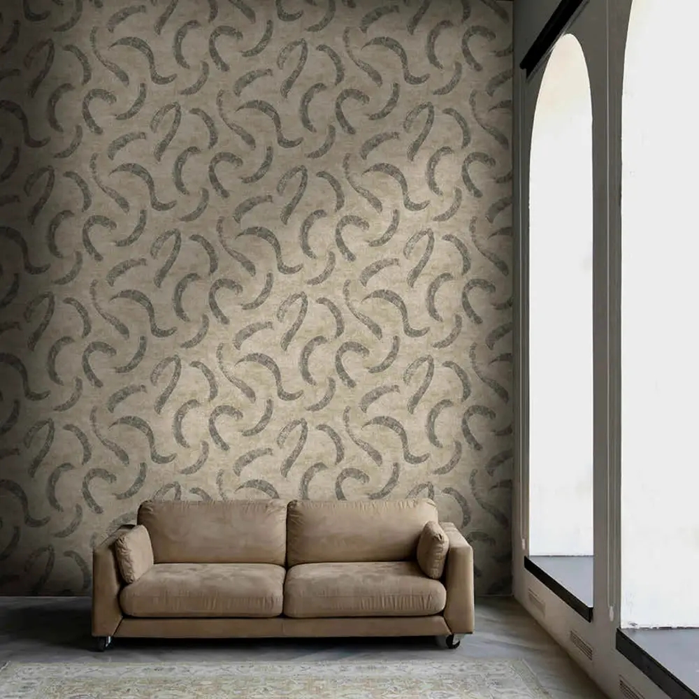 Et kunstnerisk og stemningsfuldt tapet med flydende penselstrøg og en let struktureret overflade. Designet er inspireret af sirocco-vindens bevægelser hen over Saharas sandklitter og giver væggen et levende, men balanceret udtryk. Kombinationen af lyse hør- og beigenuancer med gråsorte toner skaber en elegant kontrast, der tilfører rummet dybde og et moderne præg.