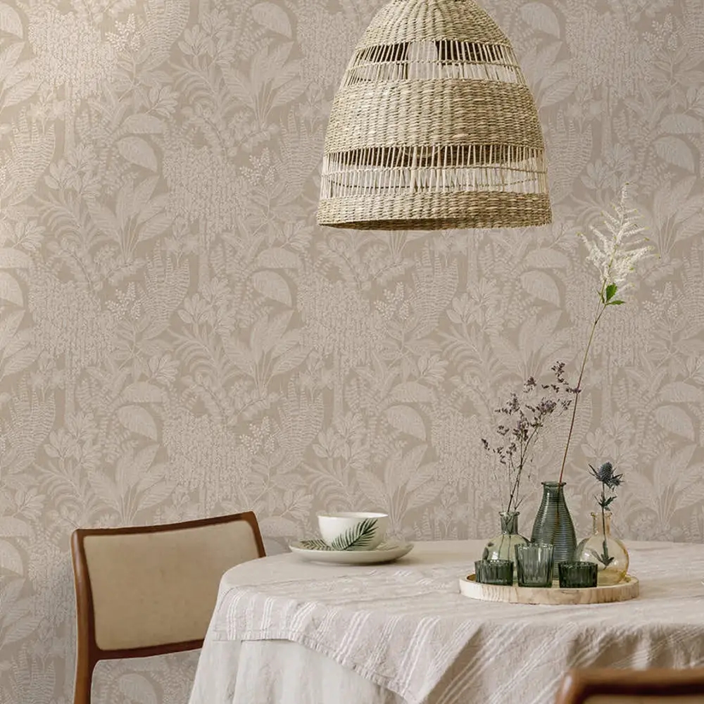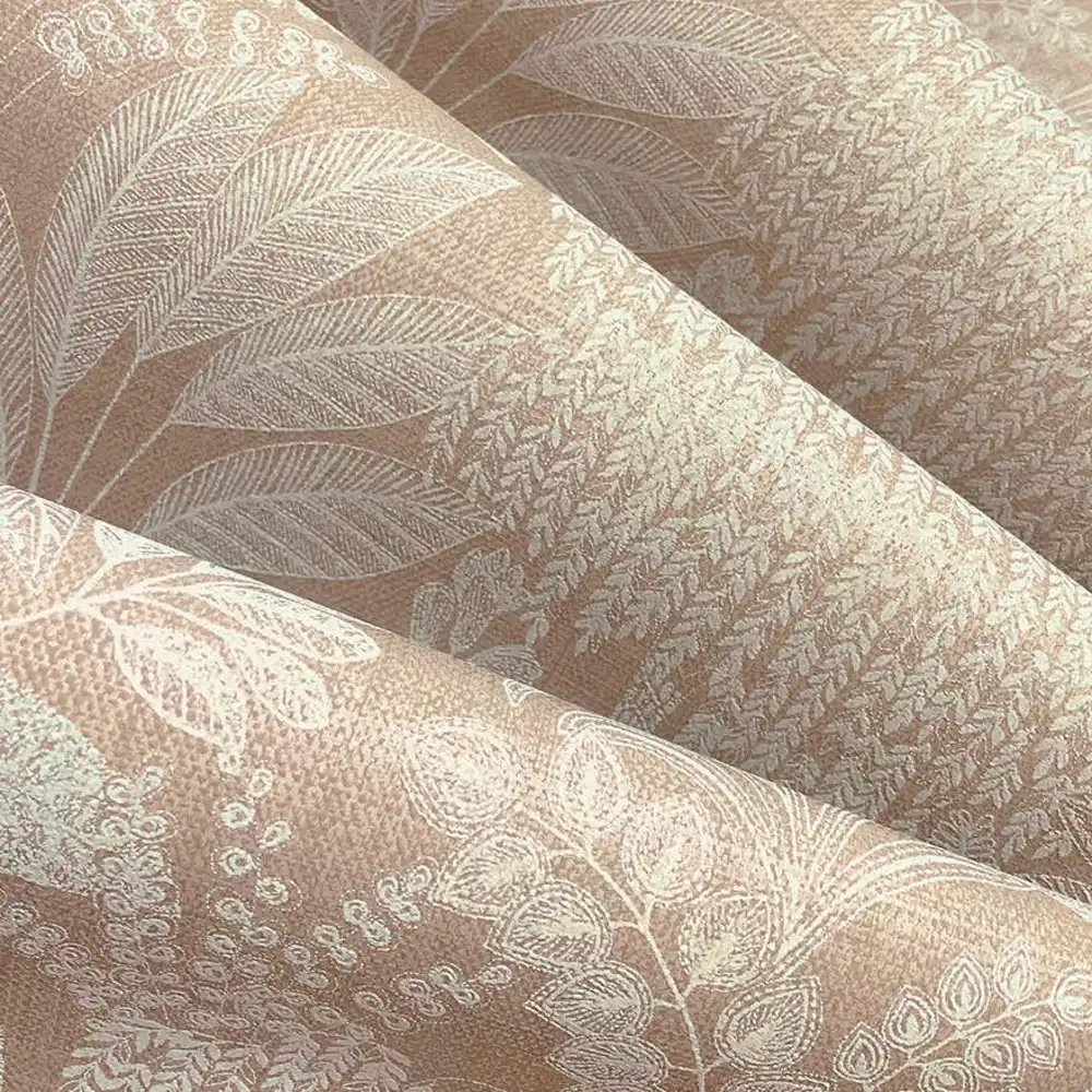 Et dekorativt og stemningsfuldt tapet inspireret af Saharas skjulte oaser, hvor vand og frodighed bryder det tørre ørkenlandskab. Mønstret består af et detaljeret samspil af forskellige bladformer, der skaber et levende og organisk udtryk. De bløde rosa nuancer giver tapetet varme og lethed, mens den matte overflade tilfører et roligt og afdæmpet præg, der balancerer det dekorative design.