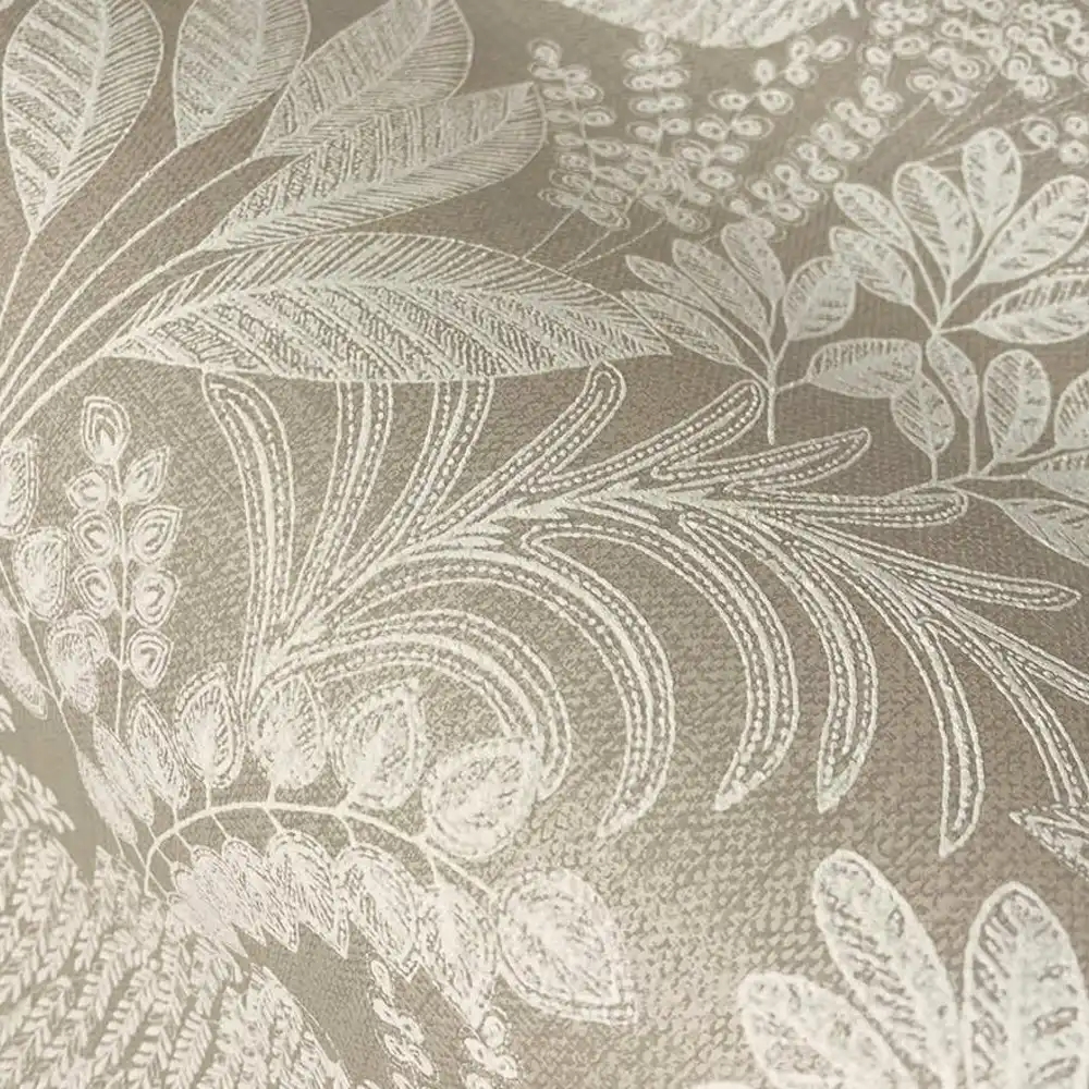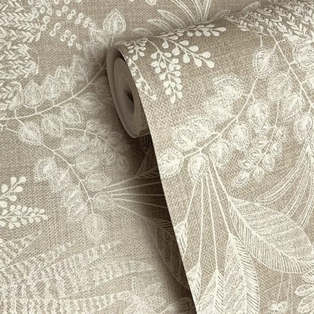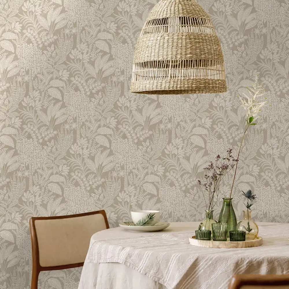 Et roligt og dekorativt tapet inspireret af Saharas skjulte oaser, hvor frodig vegetation opstår midt i det tørre ørkenlandskab. Mønstret består af et detaljeret samspil af forskellige bladformer, som giver væggen et levende, men afbalanceret udtryk. De varme beige nuancer skaber ro og lethed i rummet, mens den matte overflade understøtter et afdæmpet og elegant helhedsindtryk.