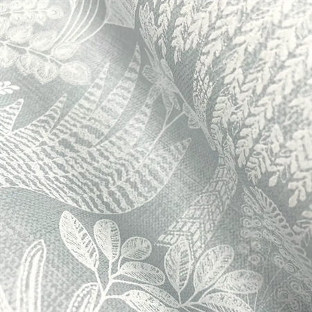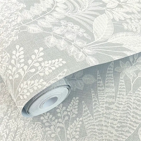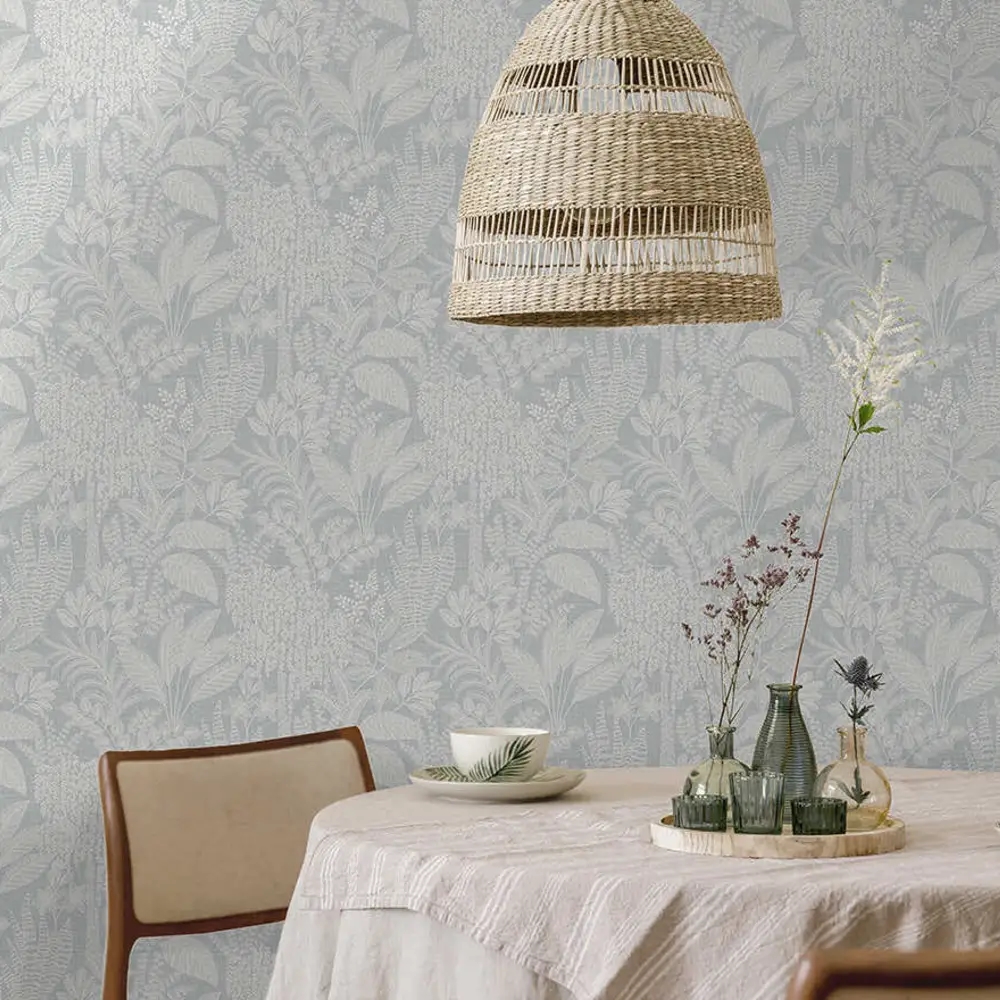 Et roligt og stemningsfuldt tapet inspireret af Saharas skjulte oaser, hvor frodig vegetation bryder det tørre ørkenlandskab. Mønstret består af et detaljeret samspil af forskellige bladformer, som skaber et levende, men harmonisk udtryk. De lyse blå nuancer giver tapetet lethed og friskhed, mens den matte overflade understøtter en afdæmpet og elegant helhed.