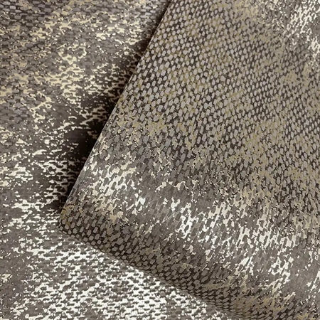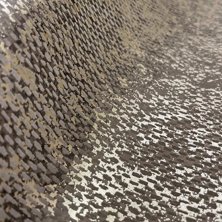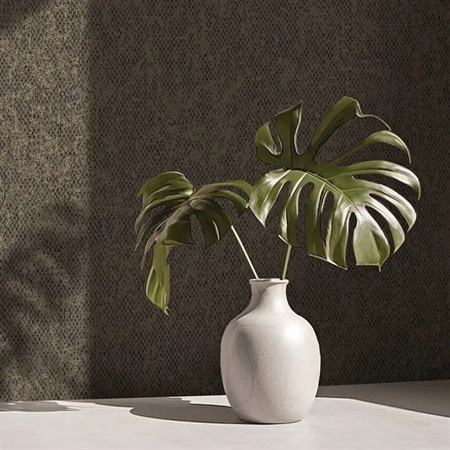 Et eksklusivt og stemningsfuldt tapet, der gengiver udtrykket af groft, vævet tekstil. Den lette relief skaber dybde i overfladen, mens metalliske detaljer under det akrylbaserede vævemønster giver et diskret og elegant spil i lyset. De gråsorte nuancer kombineret med gyldne accenter tilfører rummet et markant og sofistikeret udtryk med tydelig karakter.