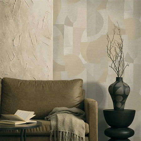 Et abstrakt og roligt tapet inspireret af Saharas bølgende sandklitter og ørkenens skiftende lys fra dag til nat. De bløde, geometriske former er sammensat i harmoniske farvetoner, der skaber dybde og balance i udtrykket. En lagdelt akrylstruktur tilfører overfladen liv og bevægelse og giver associationer til sandstormenes spor i landskabet. De sandfarvede nuancer skaber et varmt og naturligt udtryk, der bringer ro ind i rummet.