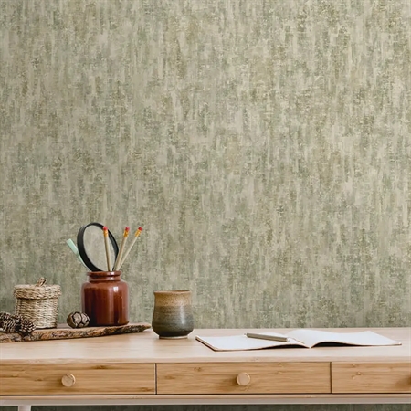 Modulo Sage kombinerer bløde grønne nuancer med et flydende akvareludtryk, hvor farverne toner naturligt ud og skaber en rolig stemning. De fine metalliske detaljer fanger lyset og giver tapetet et elegant spil, der ændrer sig, når du bevæger dig i rummet.