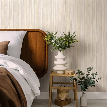 Calico Dove kombinerer brede, bløde striber med penselstrøg, der skaber en rolig bevægelse på væggen. Den matte tekstur står i smuk kontrast til de diskrete metalliske detaljer, som tilfører en glød, der skifter med lyset.