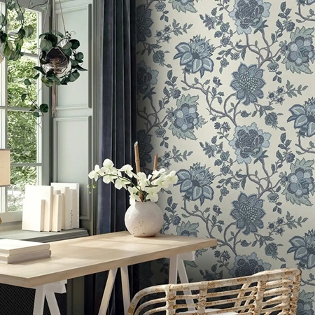Regan Blue fra The Lost Garden-kollektionen er inspireret af den engelske Jacobean-stil og bringer romantisk elegance ind i hjemmet. Med sit detaljerige blomstermønster i klassiske blå nuancer tilfører tapetet både varme og historisk charme – perfekt til dig, der ønsker et tidløst og stilfuldt udtryk.