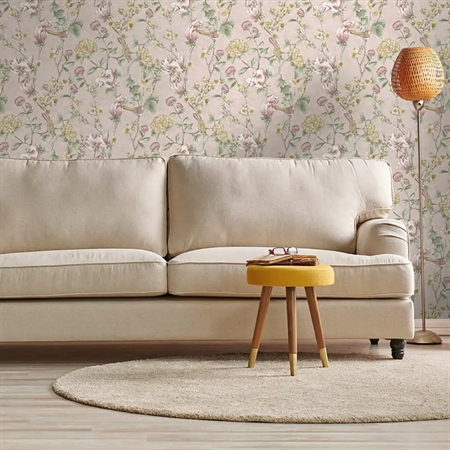Et poetisk tapetdesign fra The Lost Garden-kollektionen af Holden Decor. Nightingale Cream er fyldt med florlette blomster og små nysgerrige fugle, der giver rummet en romantisk og landlig stemning – inspireret af idylliske engelske haver i fuldt flor.