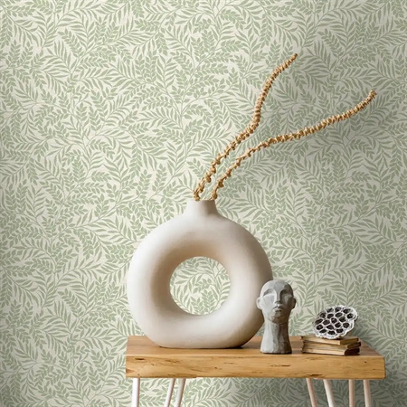 Et smukt tapet med bladranker i støvede grønne toner. Laurel Sage bringer naturens ro ind i rummet og skaber en blid, afslappet stemning – perfekt til både stue, soveværelse og gang.