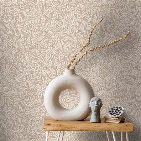 Tapet med varme nuancer og elegante bladranker. Laurel Orange kombinerer enkelhed og naturinspiration i et design, der skaber hygge og en rolig atmosfære i hjemmet.