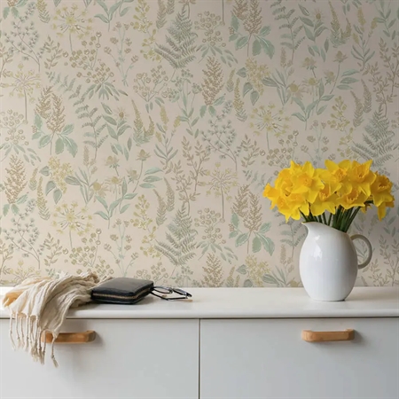 Et roligt og romantisk tapet med florlette vilde blomster, der bølger som på en sommereng i det engelske landskab. Calvert Meadows forener naturens ynde med afdæmpede beige toner og skaber et fredfyldt udtryk i rummet. Et tapet der bringer følelsen af blomstrende marker og landlig idyl ind i hjemmet – perfekt til både soveværelse, stue eller entré.