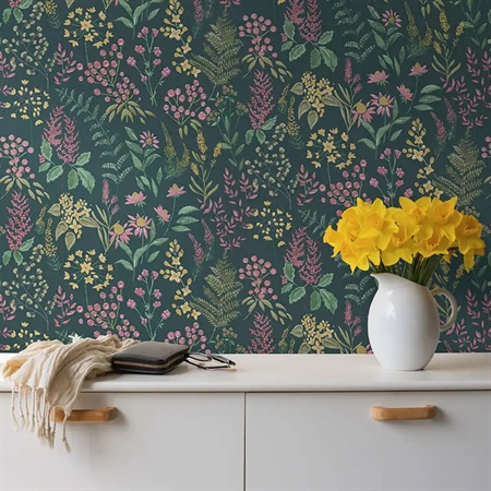 Et romantisk og farverigt tapet med inspiration fra det engelske landskab. Calvert Meadows Teal Pink bringer liv til rummet med dansende blomster i nuancer af rosa og teal. Designet skaber en fredfyldt og naturlig atmosfære med masser af varme og personlighed.
