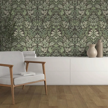 Tavira Charcoal Green er et dramatisk tapetdesign, der forener skovens vildskab med elegant symmetri. Med mørkgrønne og kulgrå nuancer skaber tapetet en stemningsfuld baggrund med spejlede blade og botaniske detaljer – perfekt til dig, der ønsker at bringe naturens dybde og mystik ind i hjemmet.