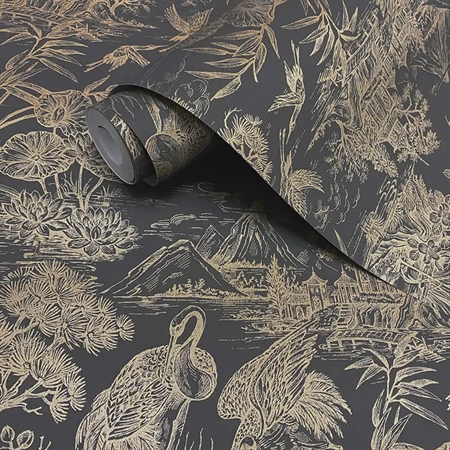 Mystik og elegance i gyldent skær. Natoru Charcoal Gold forener japansk æstetik med dramatiske kontraster – hvor yndefulde traner flyver over en mørk, stemningsfuld bund.