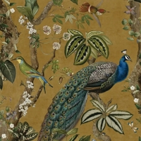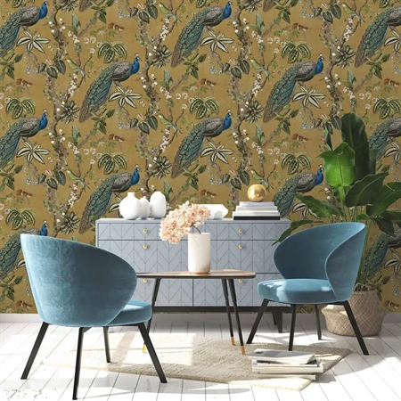 Et varmt og dekorativt tapet med botanisk motiv og et klassisk præg. Klatreplanter og bladrige grene breder sig over væggen, mens en påfugl i fuld figur tilfører et raffineret fokuspunkt. Den gyldne okkertone giver en behagelig varme og et eksklusivt udtryk til rummet.