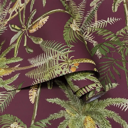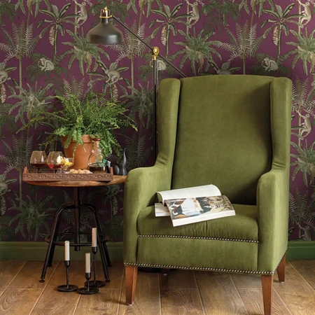 Et livligt tapet med tropisk regnskovsmotiv i dybe bærtoner. Mønsteret viser grøn frodighed og nysgerrige aber i bevægelse gennem palmekronerne, hvilket tilfører rummet energi og et strejf af eksotisk dyreliv.