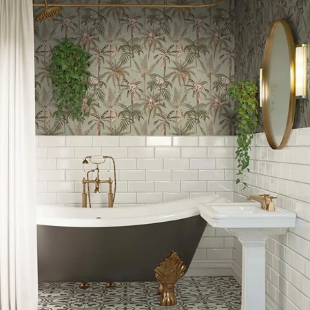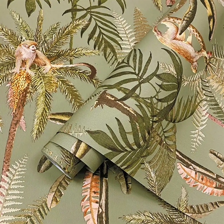 Et tropisk tapet med roligt udtryk og grønne nuancer. Ateles Sage viser en frodig regnskov med aber i bevægelse blandt palmer og blade – alt sammen i en afdæmpet salviegrøn farve, der bringer naturens stemning ind med en balanceret energi.