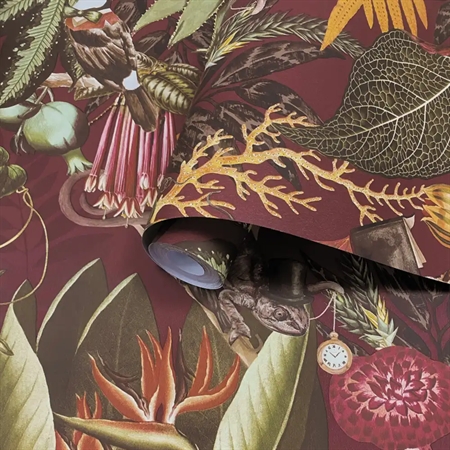 Et legende og farverigt tapet med et strejf af humor. Tropiske blade danner rammen om papegøjer med krone, kamæleoner med høj hat og små bush babies med monokel – alt sat mod en mat, bærfarvet bund, der skaber dybde og karakter.