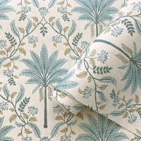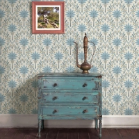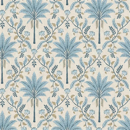 Et dekorativt tapet med et let og luftigt palmemotiv kombineret med et grafisk espalier. De blå nuancer giver tapetet et roligt og afbalanceret udtryk, mens de bløde former tilfører rummet en naturlig lethed. Udtrykket er inspireret af tropisk vegetation, men holdt i en afdæmpet stil, der fungerer harmonisk i både opholdsrum og soveværelse.
