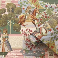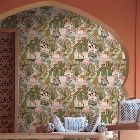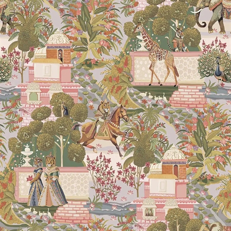 Et rigt og detaljeret tapet med et fortællende motiv inspireret af indisk arkitektur og mytiske universer. Erotiske buer, kupler og udsmykkede detaljer danner rammen om elegante dyr og fantasifulde figurer, som tilsammen skaber et levende og dekorativt udtryk. Farvespillet giver tapetet karakter og dybde og gør det velegnet som et markant statement på væggen.