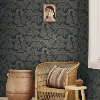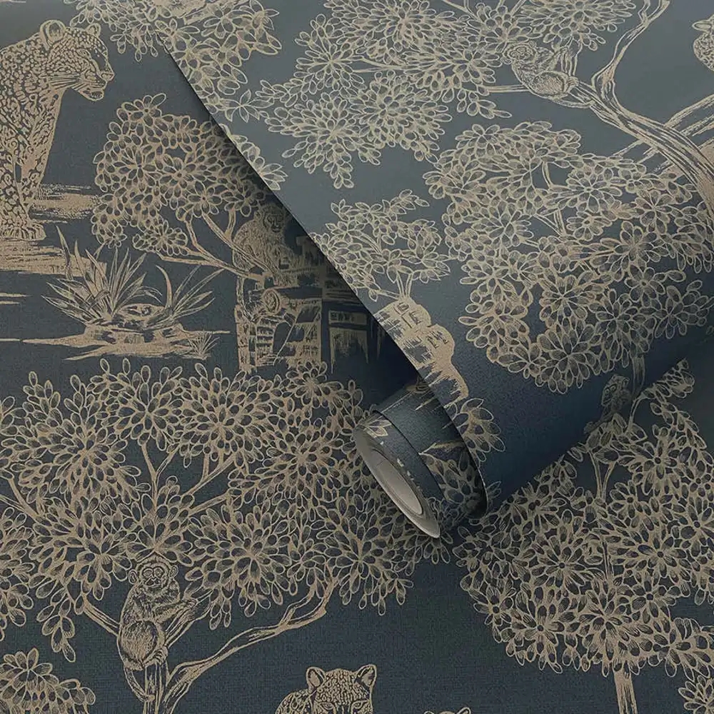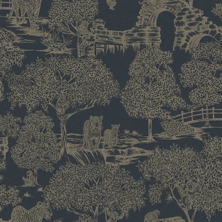 Et stemningsfuldt tapet med et detaljeret og fortællende motiv, hvor eksotiske dyr bevæger sig blandt patinerede ruiner fra en svunden civilisation. Leoparder og aber tilfører designet liv og lethed, mens de dybe navy nuancer skaber et elegant og markant udtryk. En diskret metallisk glans giver overfladen dybde og tilfører rummet et eksklusivt og indbydende præg.
