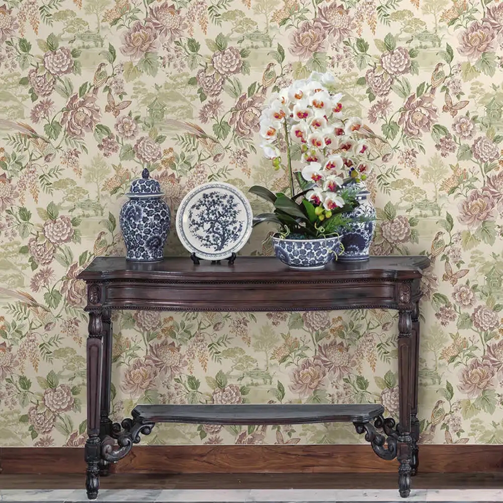 Et harmonisk og stemningsfuldt tapet, hvor store blomstrende motiver og legende fugle skaber et roligt og poetisk udtryk. Inspireret af japanske pagoder og klassiske haver forener designet natur og tradition i en afbalanceret helhed. De grønne og cremefarvede nuancer giver tapetet et let og tidløst præg, der tilfører rummet ro – samtidig med at væggen får et markant og dekorativt udtryk.