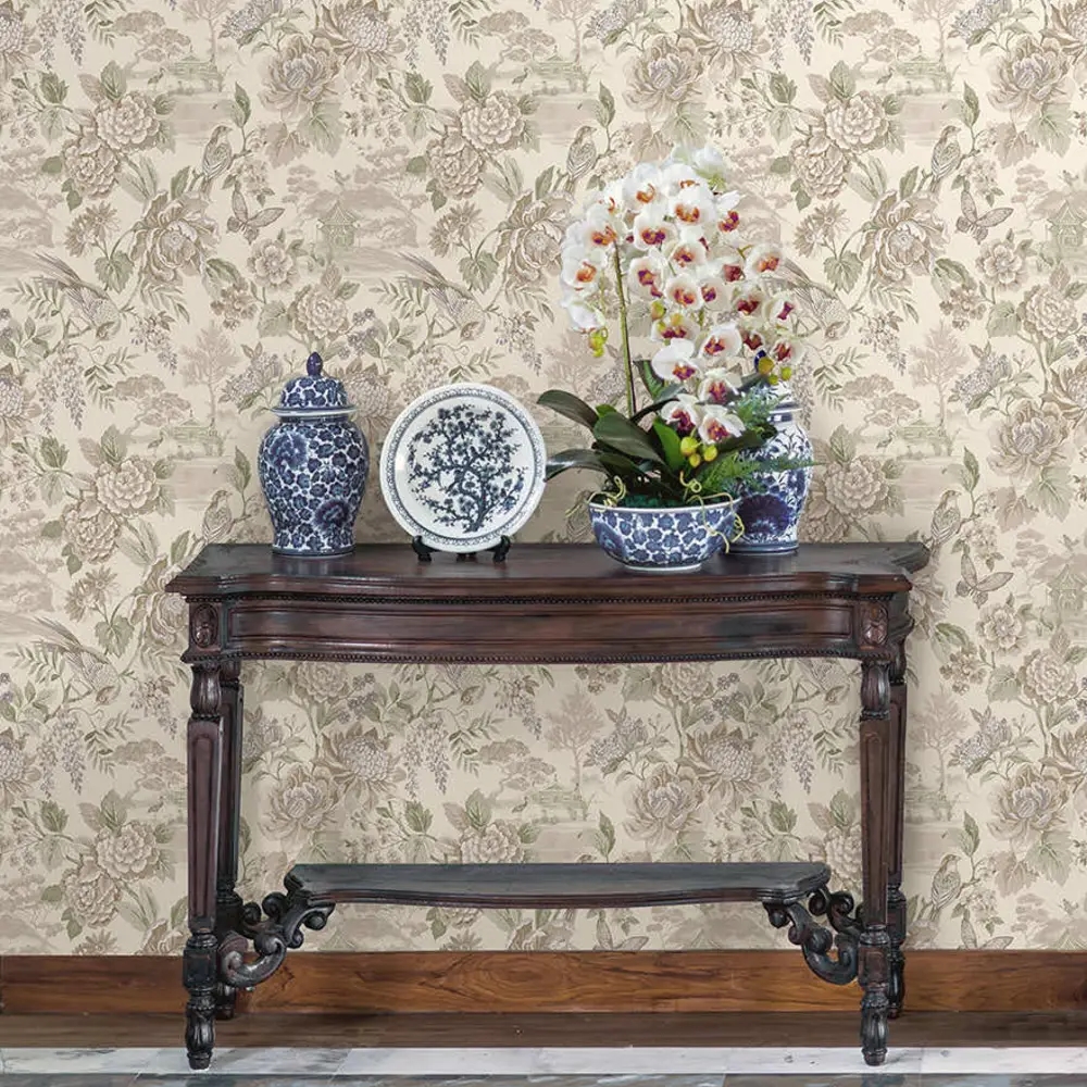 Et harmonisk og stemningsfuldt tapet, hvor store blomster og legende fugle danner et roligt og elegant udtryk. Inspireret af japanske pagoder og klassiske haver forener designet natur og tradition i en afbalanceret helhed. De lyse cremefarvede nuancer giver tapetet et let og tidløst præg, der skaber ro i rummet – samtidig med at væggen får et dekorativt og markant udtryk.